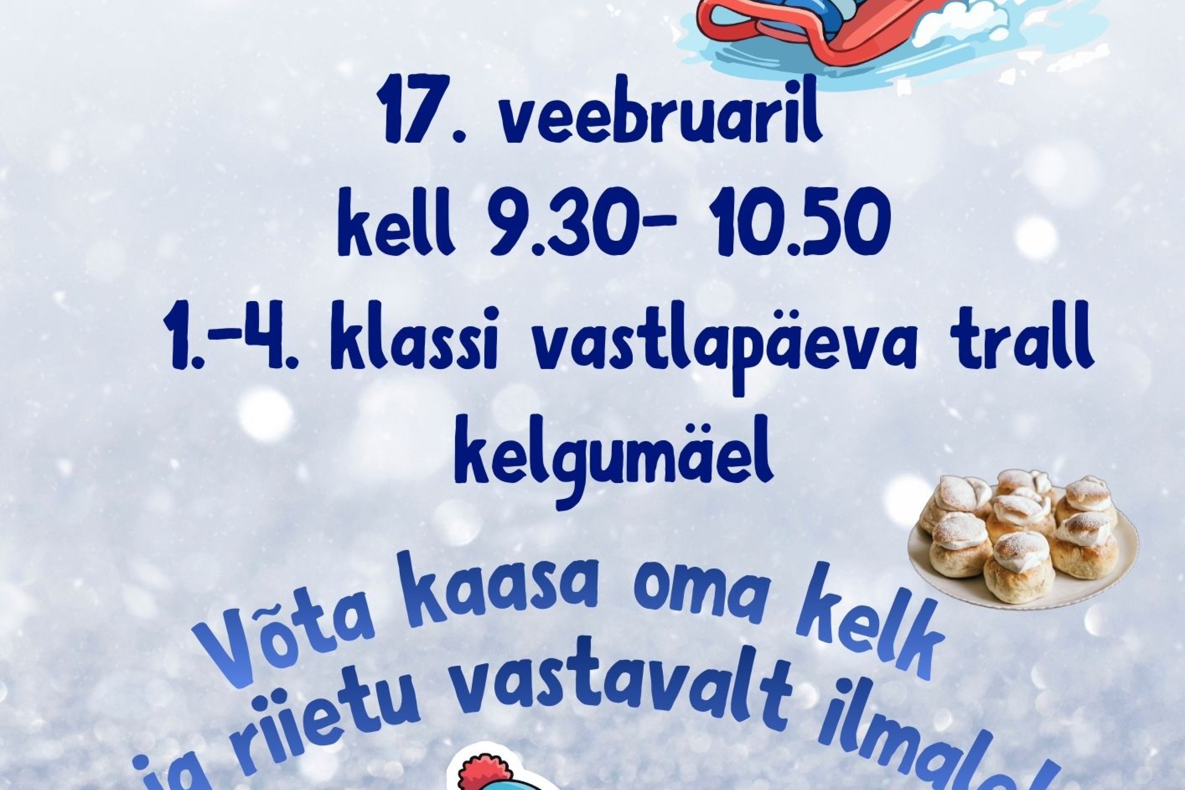17. veebruaril kell 9.30-10.50 1.-4. klassi vastlapäeva trall kelgumäel.