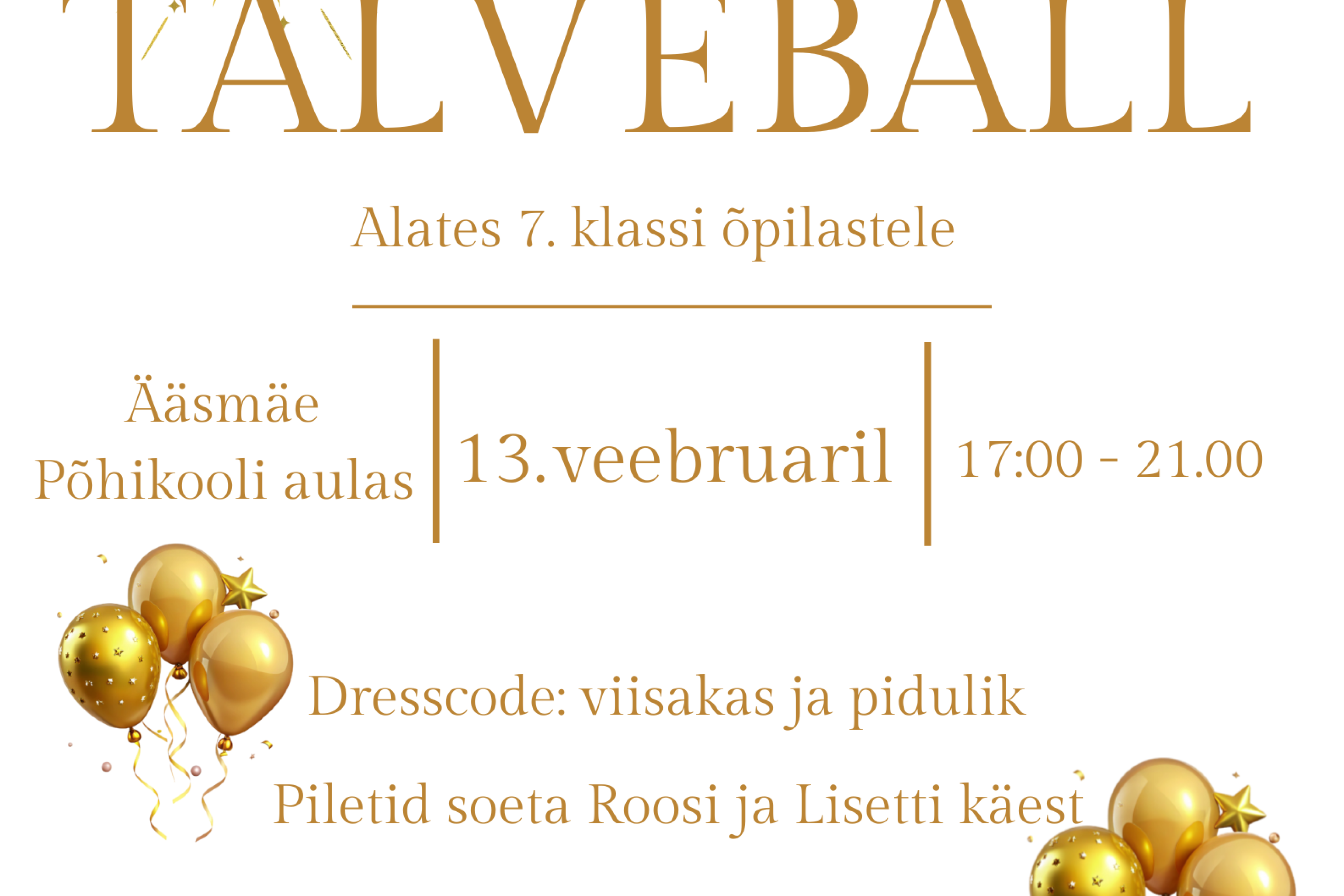 Aeg 17:00 - 21:00 Huvitegevus Ava foto Talveball 2026Dresscode: viisakas ja pidulik Vaata rohkem sündmusi Ava foto Avaldatud 03.02.2026. Viimati muudetud 03.02.2026.